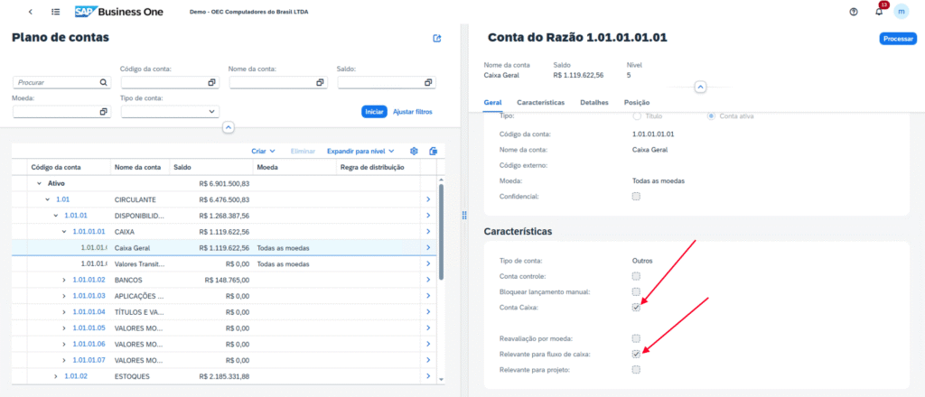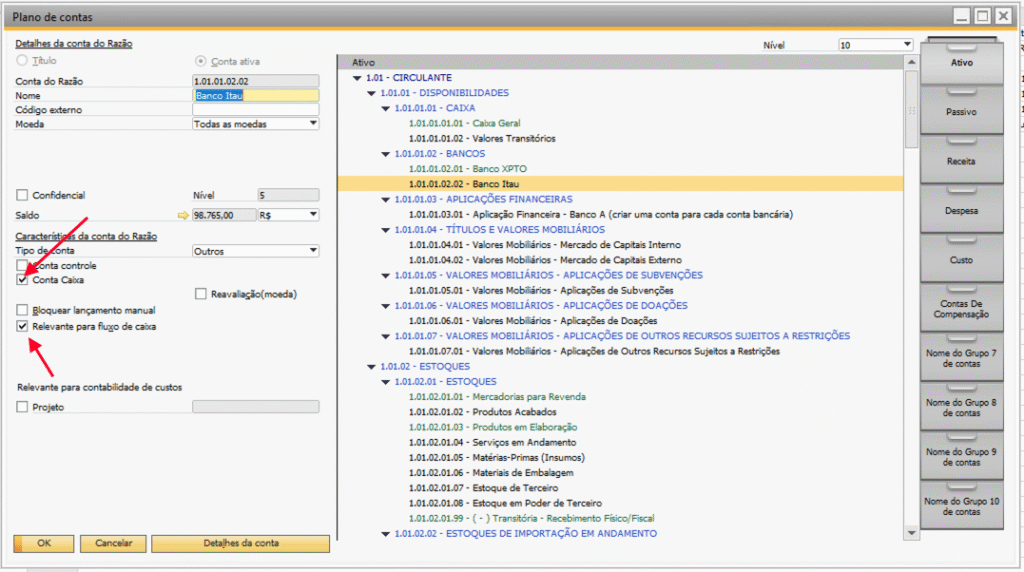 Neste modelo são apresentadas todas as contas marcadas no SAP Business One como “Contas caixa” e também marcados como “Relevantes para fluxo de caixa”.