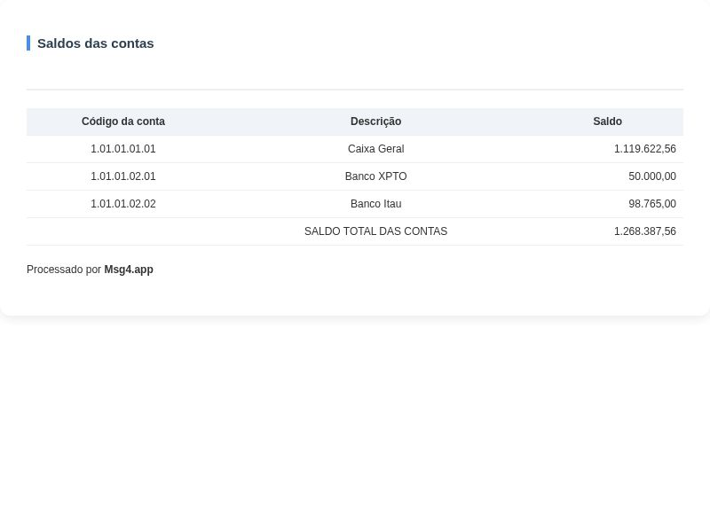 Em cenários onde o usuário necessita de um relatório de apoio com os “saldos de contas caixa”, poderá usar o relatório modelo “Saldos de contas caixa” do Msg4.