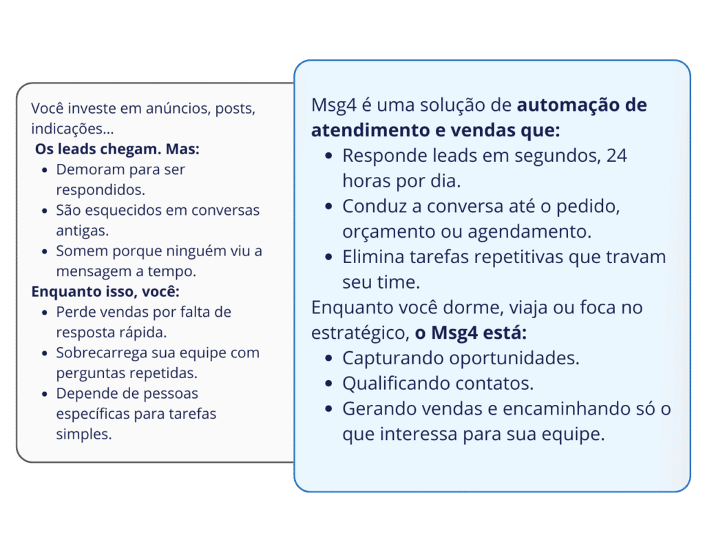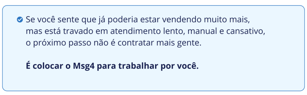 O Msg4 nasceu exatamente para resolver isso: transformar atendimento em um sistema escalável de vendas, que não depende de humor, horário ou quantidade de pessoas disponíveis.